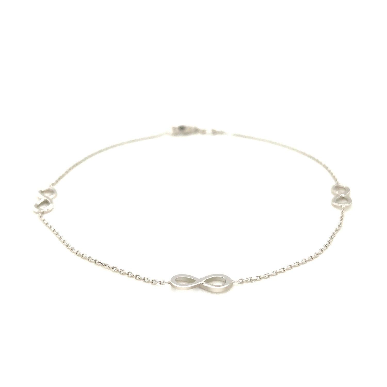 Classic, polished infinity symbols are joined by lovely sterling silver chain on this exquisite anklet. Anklet is 10 inches long and closes with a spring ring clasp.