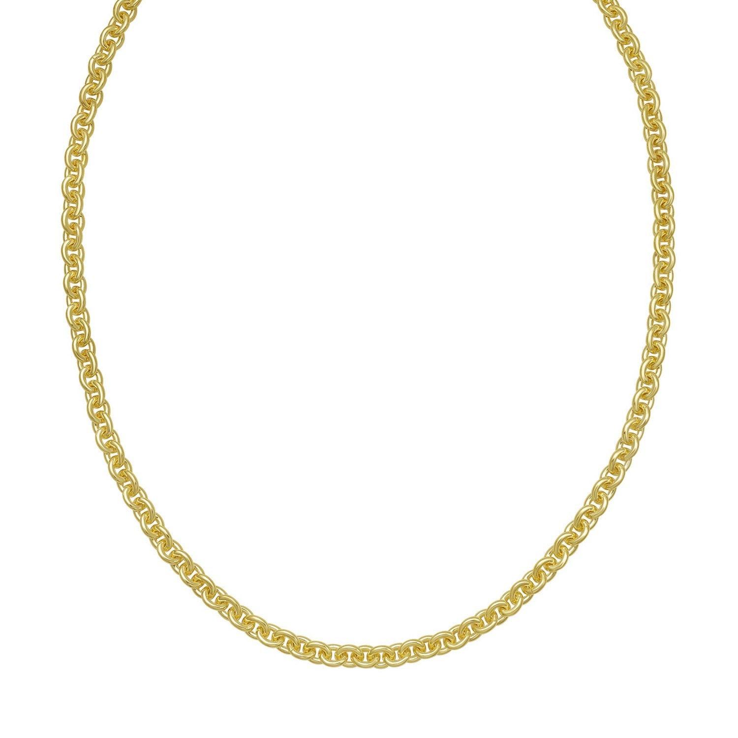 Crafted in sterling silver with a luxurious gold plating, this 5.70 mm rolo chain features strong, rounded links that deliver excellent durability and a rich, polished shine, making it a bold and versatile piece perfect for wearing alone or pairing with a standout pendant.
