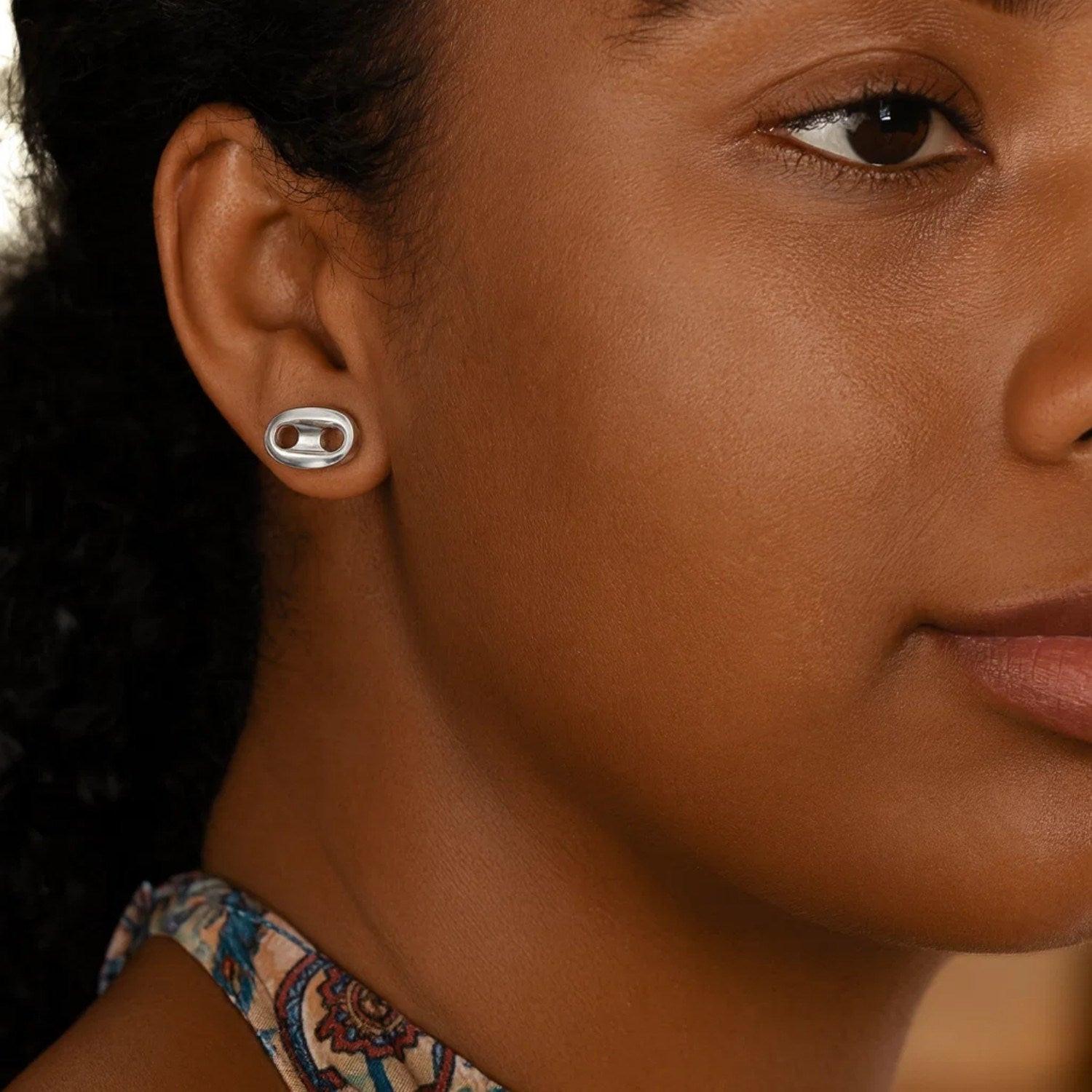 Stylish sterling silver puffed mariner stud earrings featuring a bold, nautical-inspired design with a smooth, polished finish. The puffed mariner links add dimension and shine, creating a modern, sophisticated look perfect for everyday elegance.
