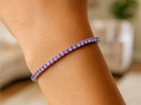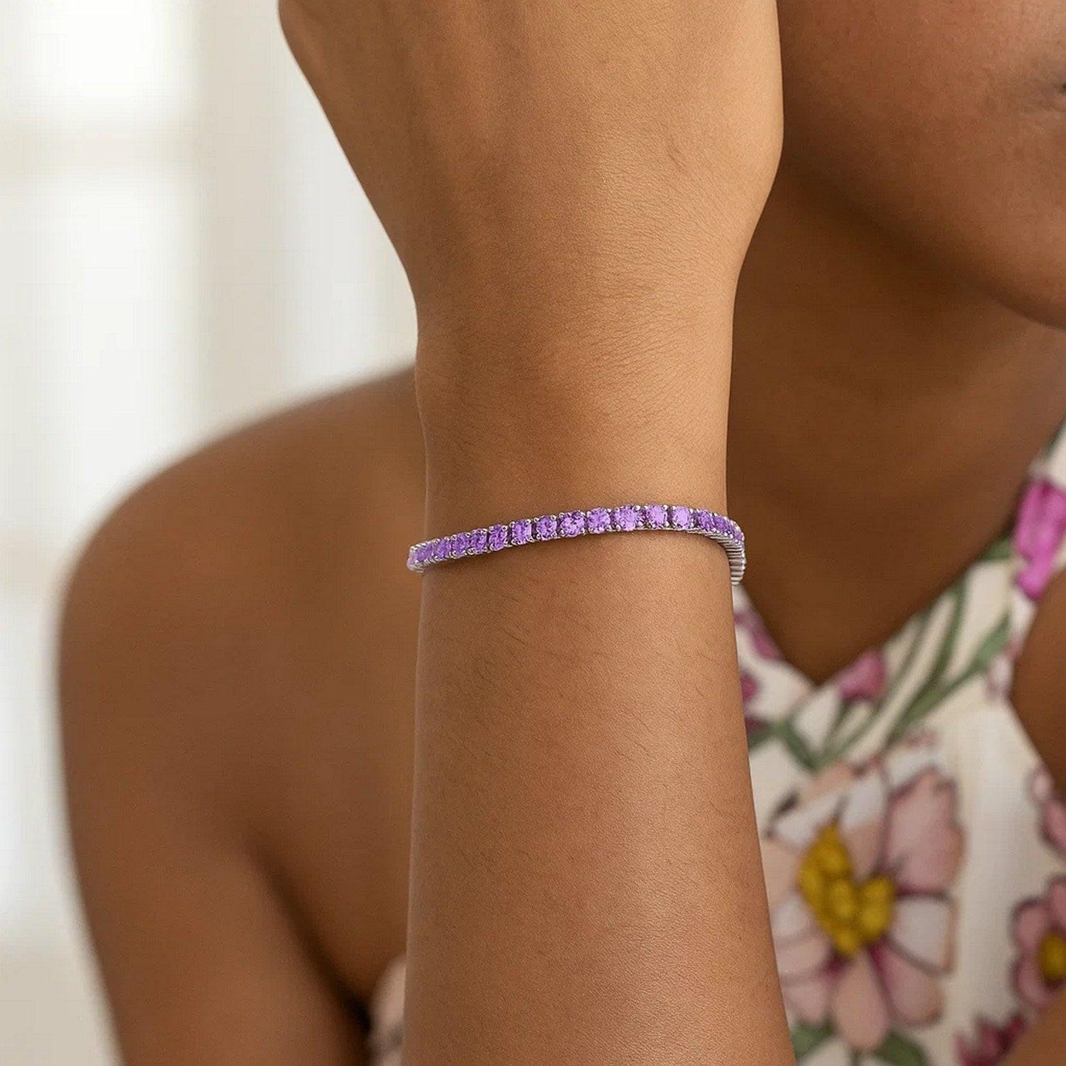 Elegant and eye catching, this Sterling Silver Purple CZ Tennis Bracelet (3.30 mm) adds vibrant color with timeless sparkle. Each round purple cubic zirconia is set in a sleek sterling silver frame, creating a continuous line of brilliance. Perfect for special occasions or adding a refined touch to everyday style, this bracelet offers a modern and colorful twist on a classic design.