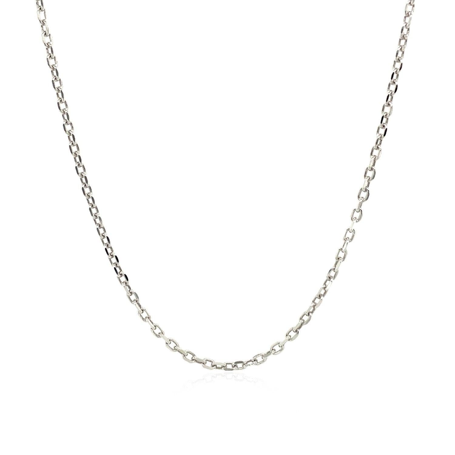 This rhodium-plated cable chain comes in sterling silver and has a width of 1.5 millimeters.