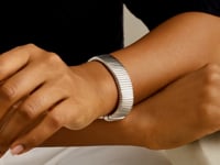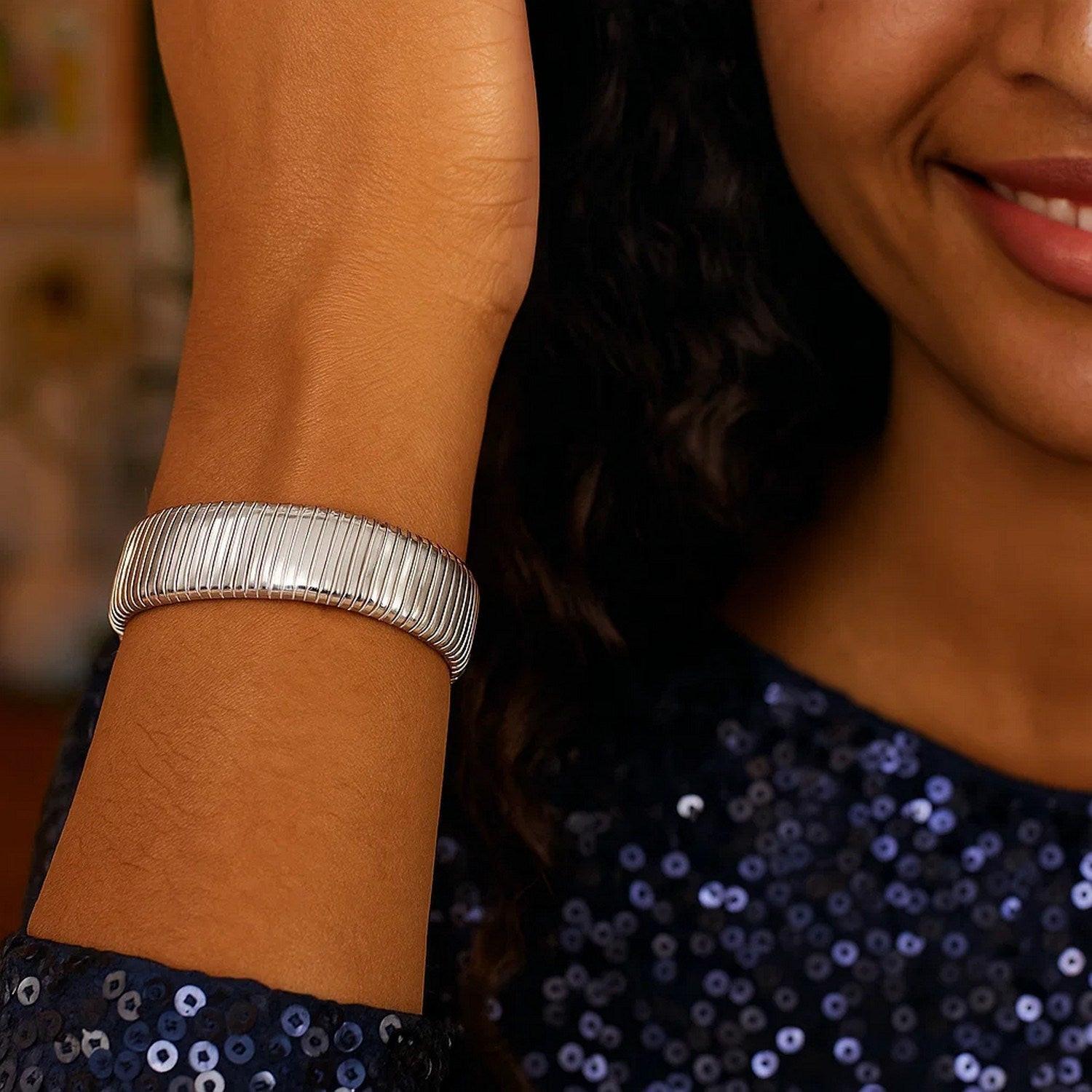 This sterling silver rhodium plated Tubogas bracelet (18.00 mm) features an ultra-wide, flexible coil design with a sleek, polished finish. Its extra-thick profile delivers bold, modern shine, making it a luxurious statement piece for any jewelry collection.