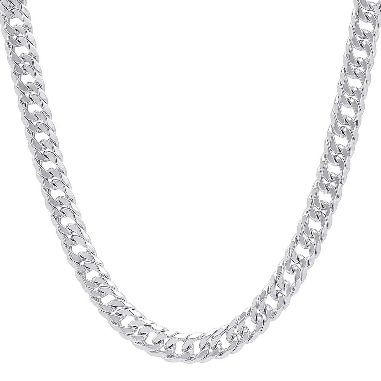 Crafted in sterling silver with a sleek rhodium finish, this 9.30 mm flat Miami Cuban chain features wide, tightly interlocking links that create a smooth, flexible drape and a bold, mirror-like shine, making it a striking statement piece perfect for wearing solo or pairing with a standout pendant.