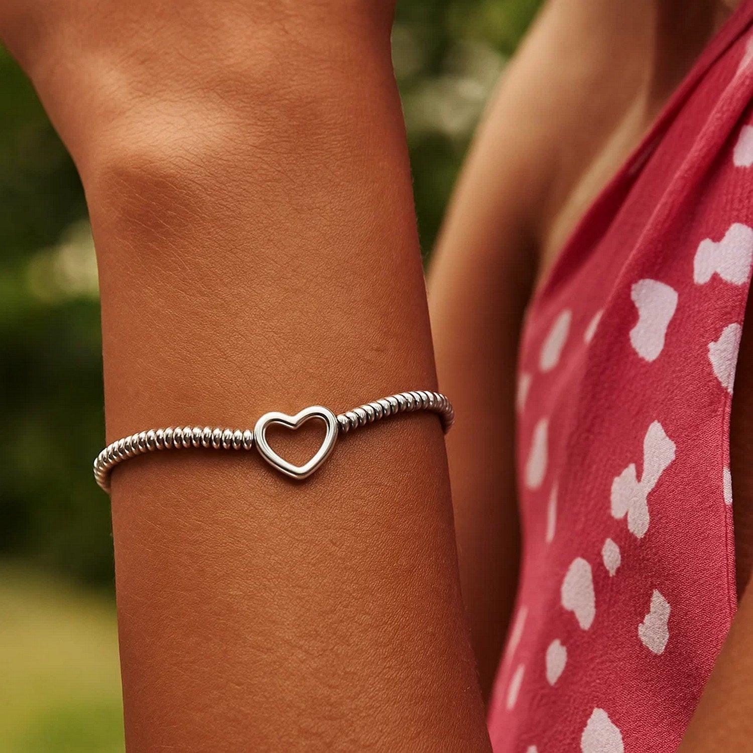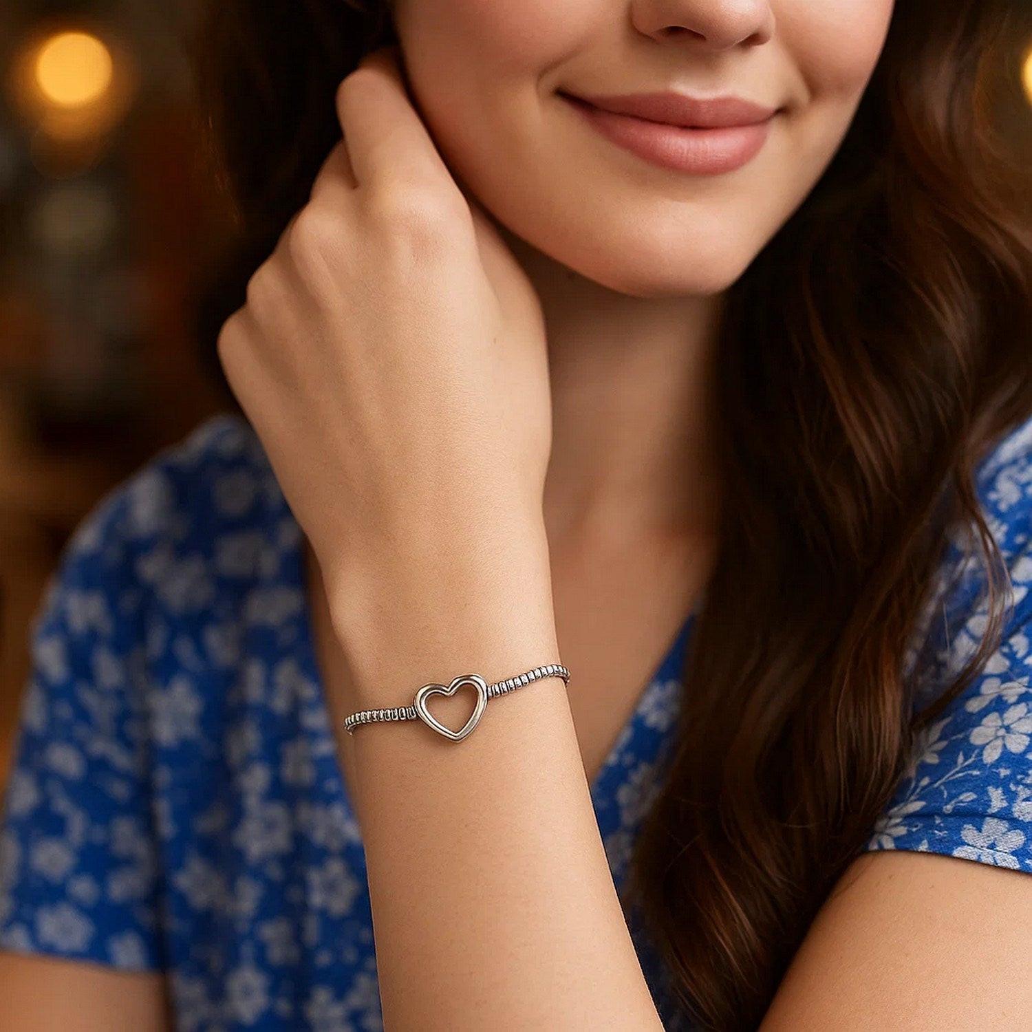 This sterling silver rhodium plated heart bead friendship bracelet features polished beads accented by a sweet heart charm on an adjustable drawstring chain. Its bright shine and meaningful design make it perfect for everyday wear, gifting, or layering.