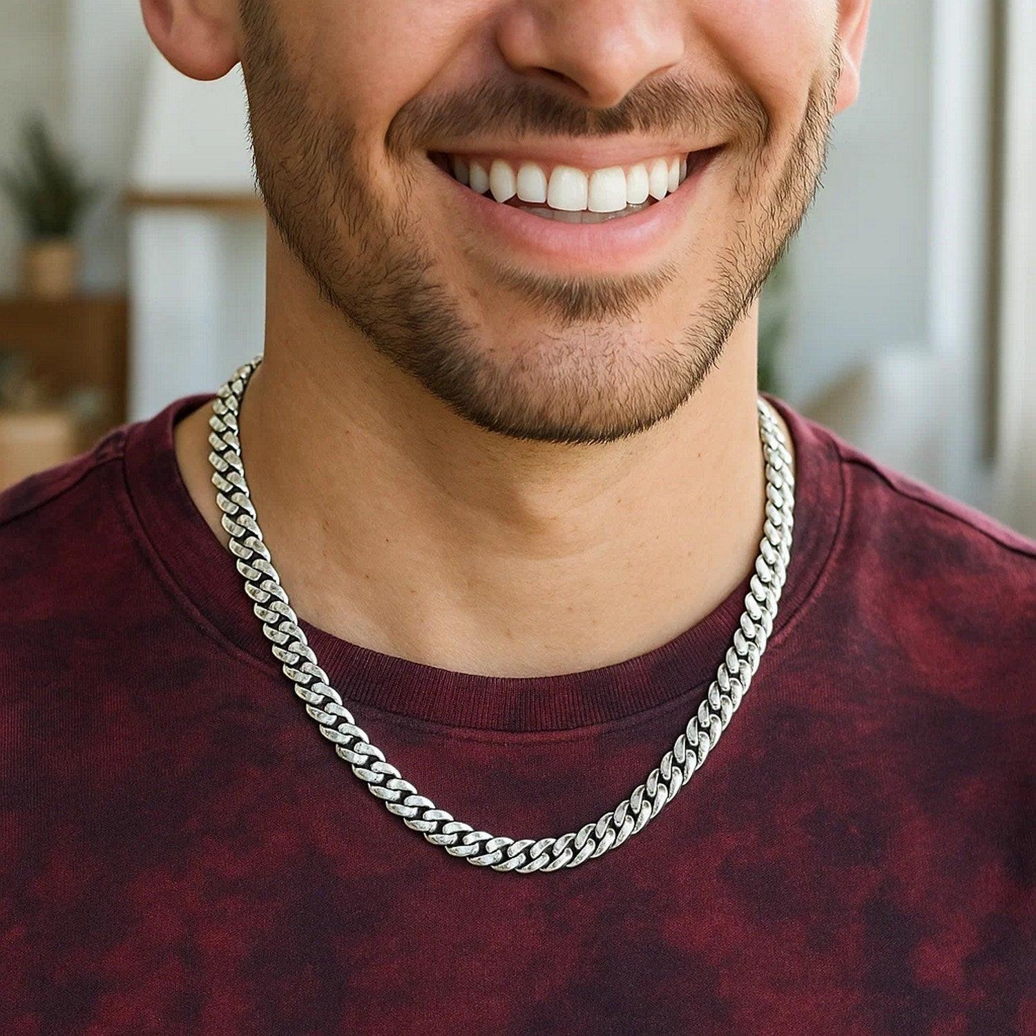 This rhodium-plated miami cuban chain comes in sterling silver and has a width of 6.30 millimeters.