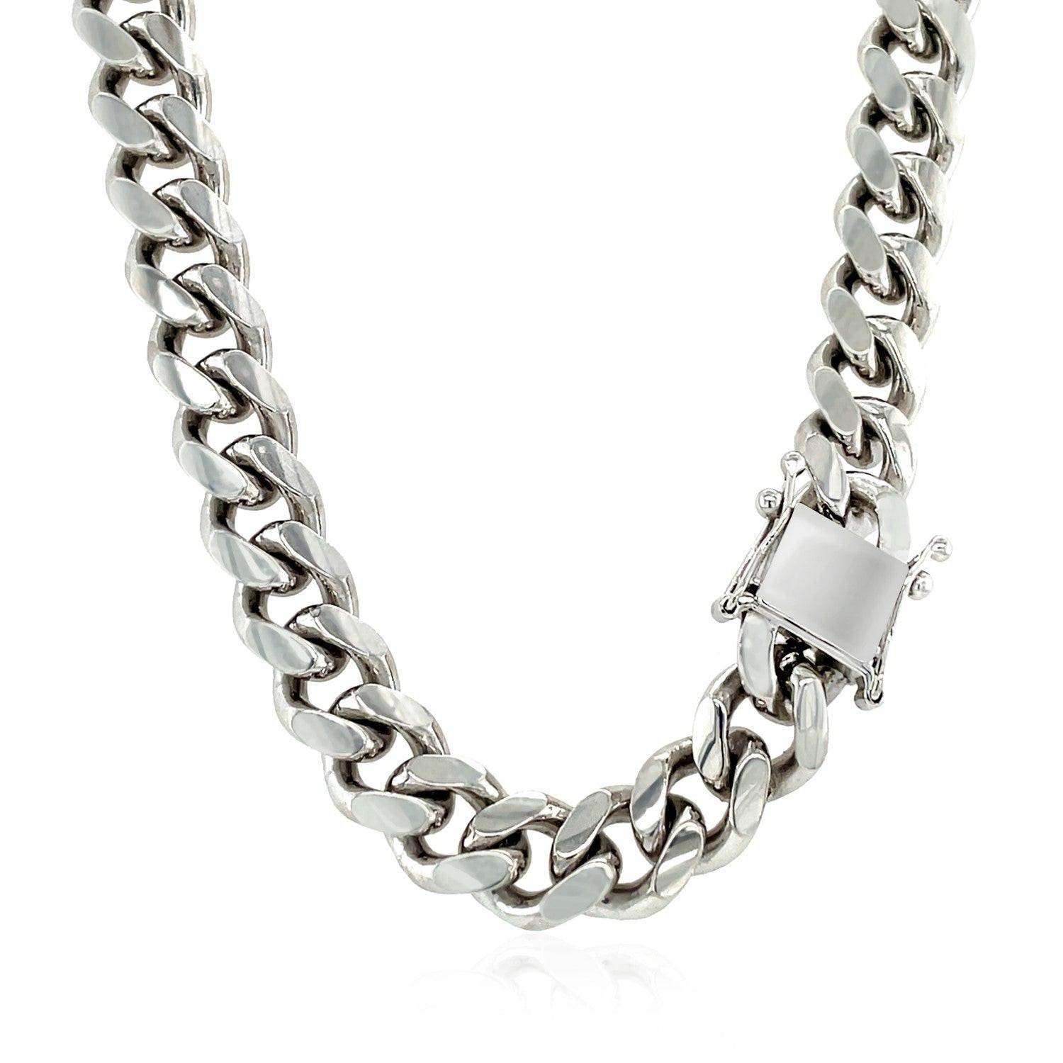 This rhodium-plated miami cuban chain comes in sterling silver and has a width of 8.40 millimeters.