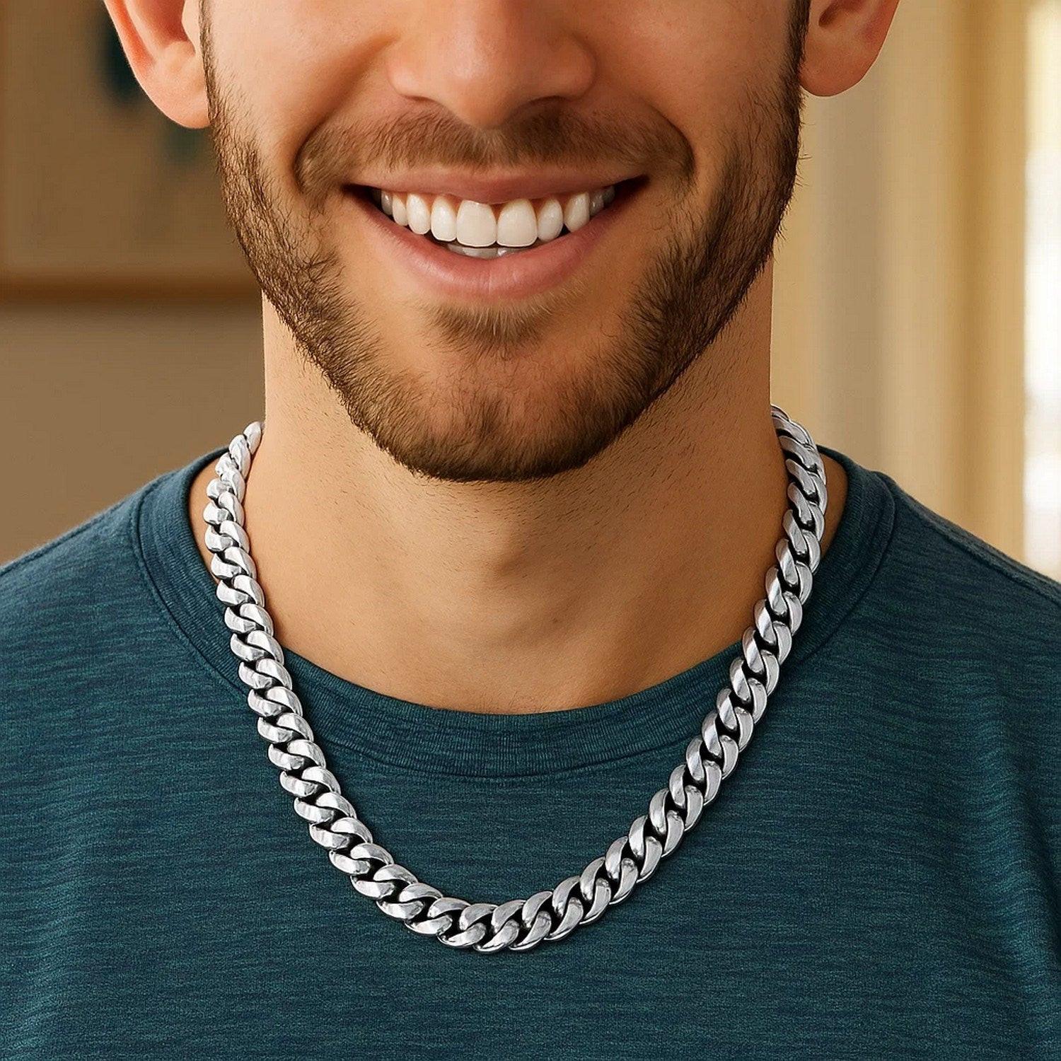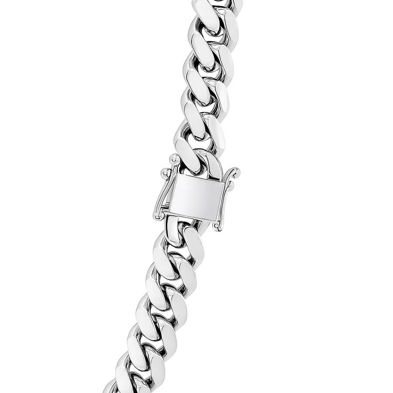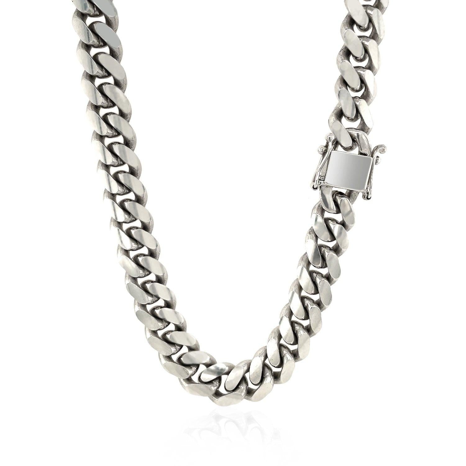 This rhodium-plated miami cuban chain comes in sterling silver and has a width of 9.80 millimeters.