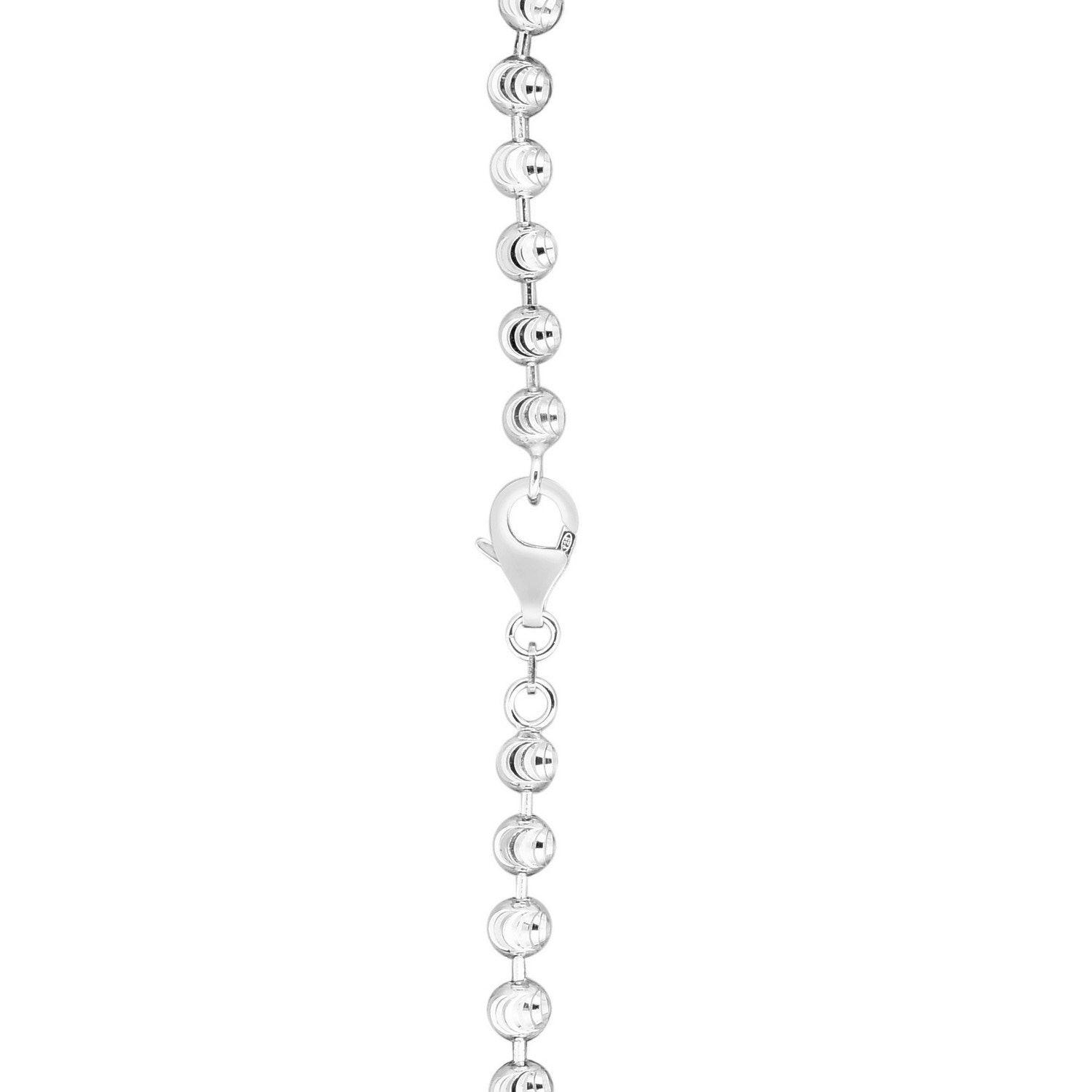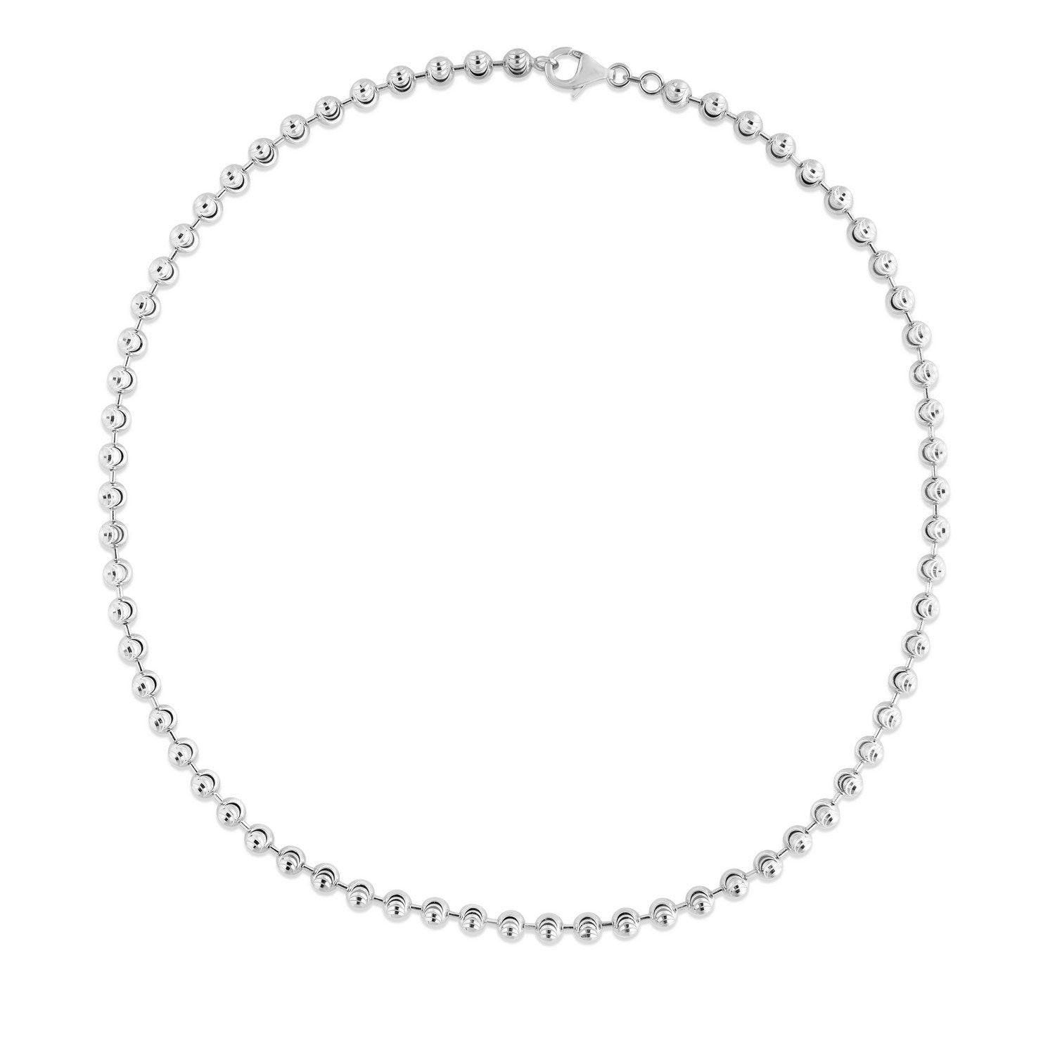 Crafted in sterling silver and finished with a bright rhodium plating, this 5.00 mm moon cut bead chain showcases larger, faceted beads that deliver striking brilliance and bold texture, creating an eye-catching statement piece perfect for wearing solo or enhancing with a standout pendant.