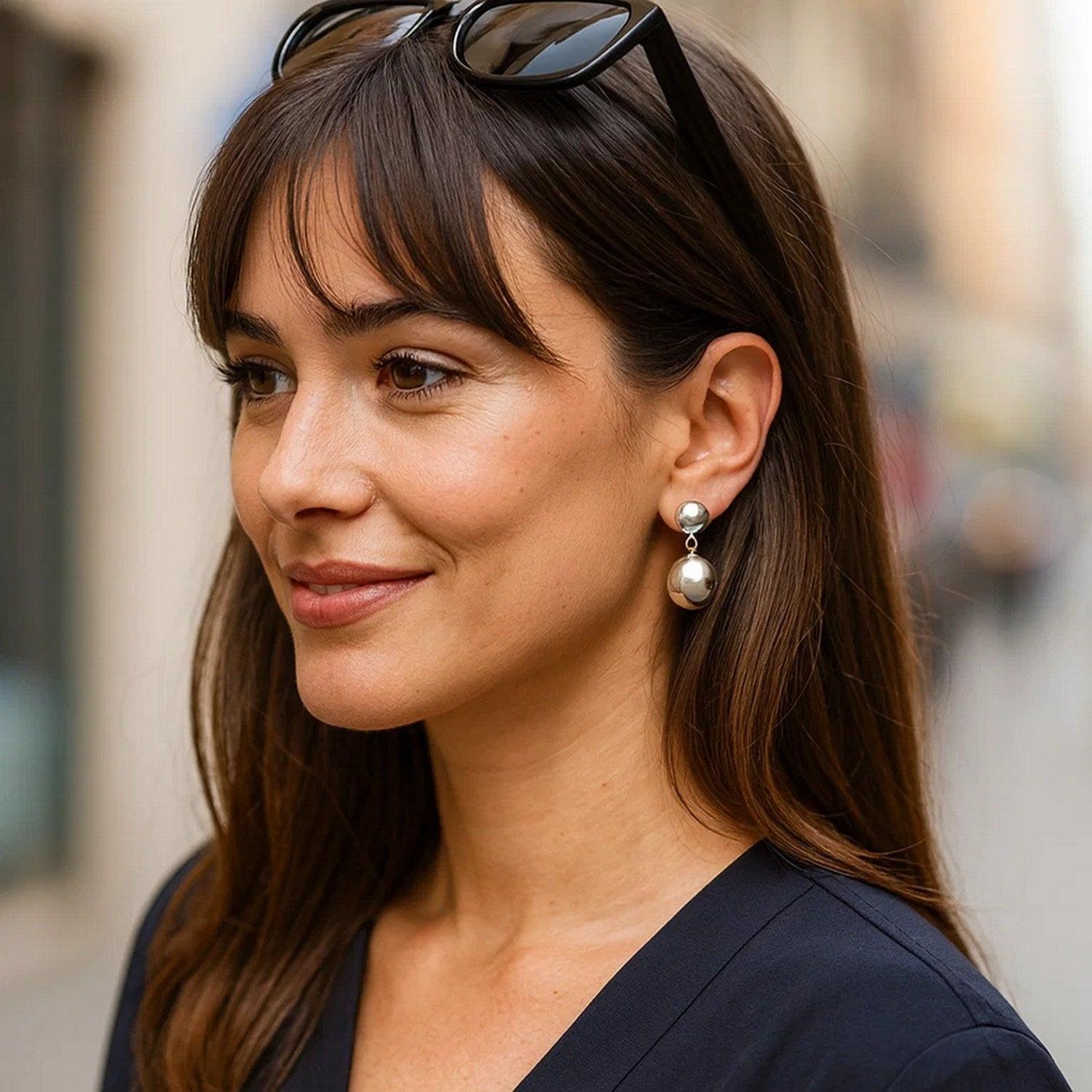 Elegant sterling silver rhodium plated puffed round double button drop earrings featuring a smooth, polished finish and a gracefully layered design. The puffed round shapes add volume and shine, while the rhodium plating enhances brilliance and durability for timeless appeal.