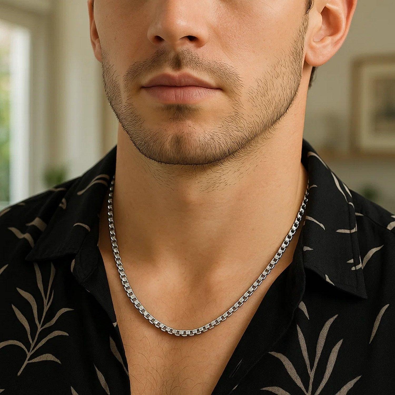 Crafted in sterling silver and finished with a sleek rhodium plating, this 3.90 mm rockstar-cut round box chain features intricately faceted links that deliver striking sparkle and bold texture, offering a durable, eye-catching design perfect for wearing solo or pairing with your favorite pendant.