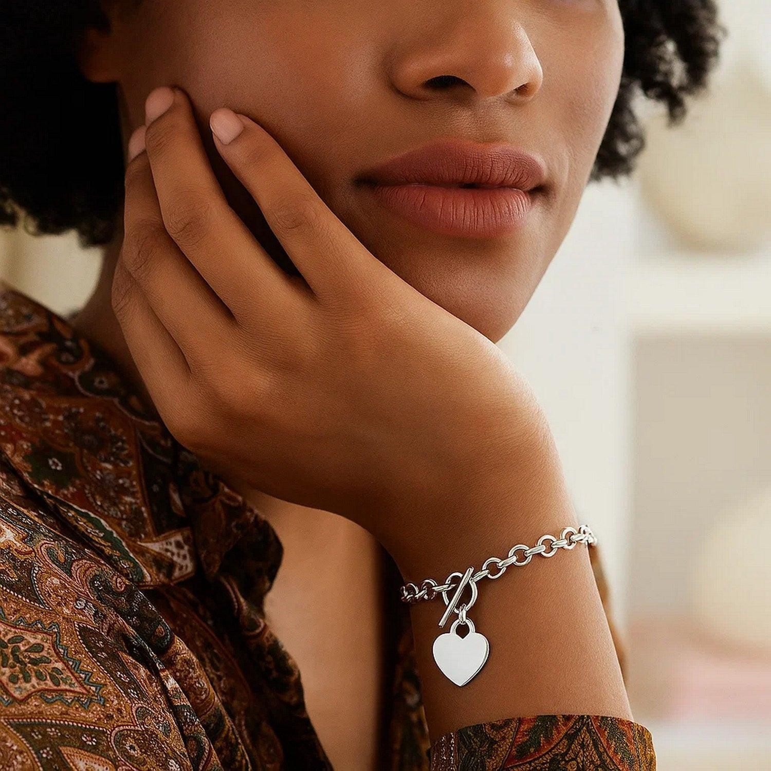 A flat heart charm accents the toggle lock on this darling rolo style chain bracelet designed in a fine rhodium plated sterling silver, this piece is available in sizes 7 1/4 inches and 8 inches.