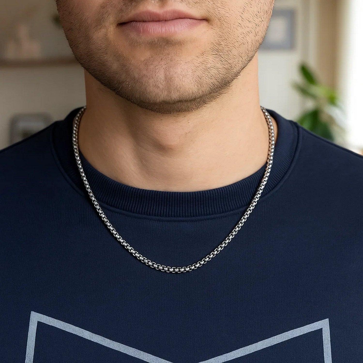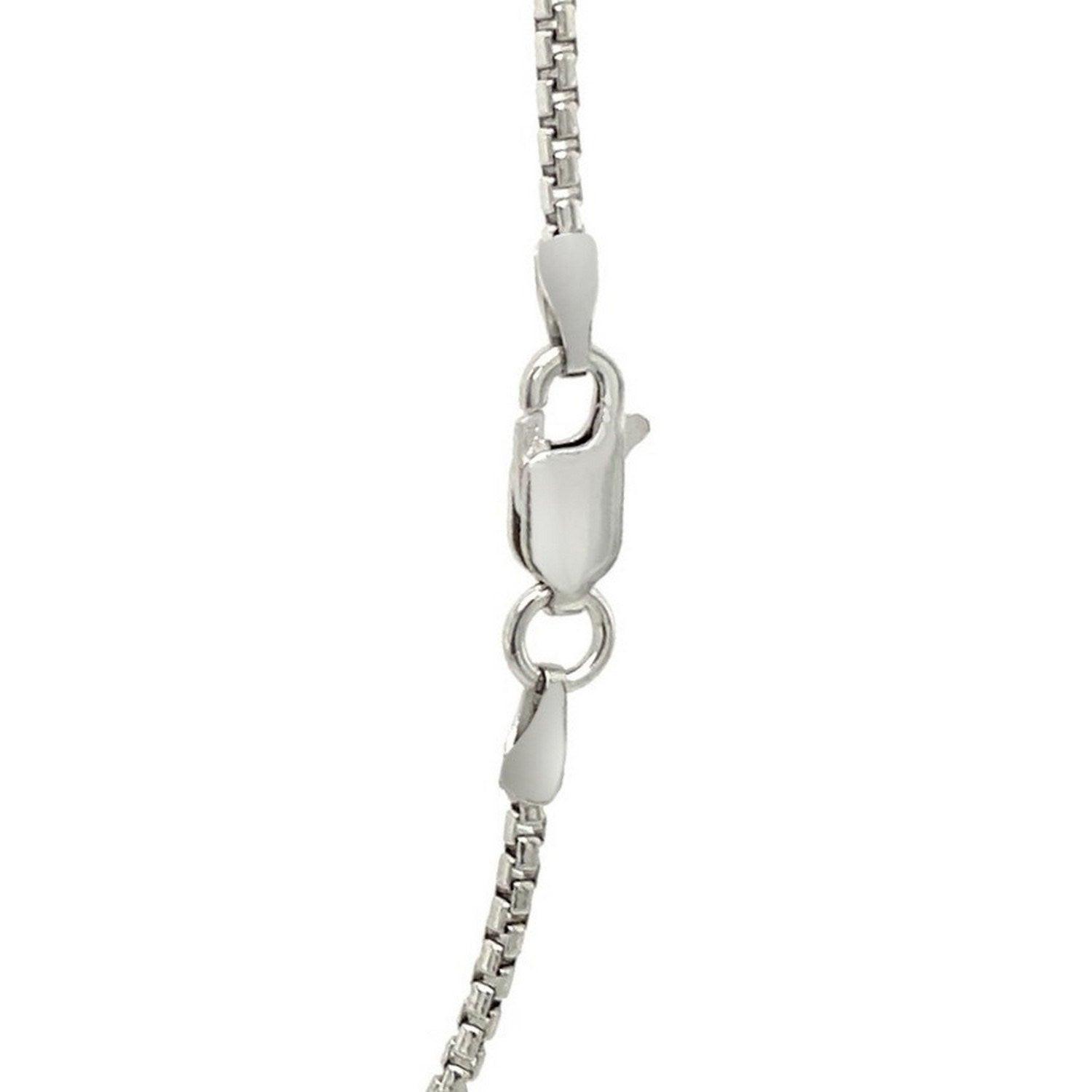 This rhodium-plated round box chain comes in sterling silver and has a width of 1.5 millimeters.