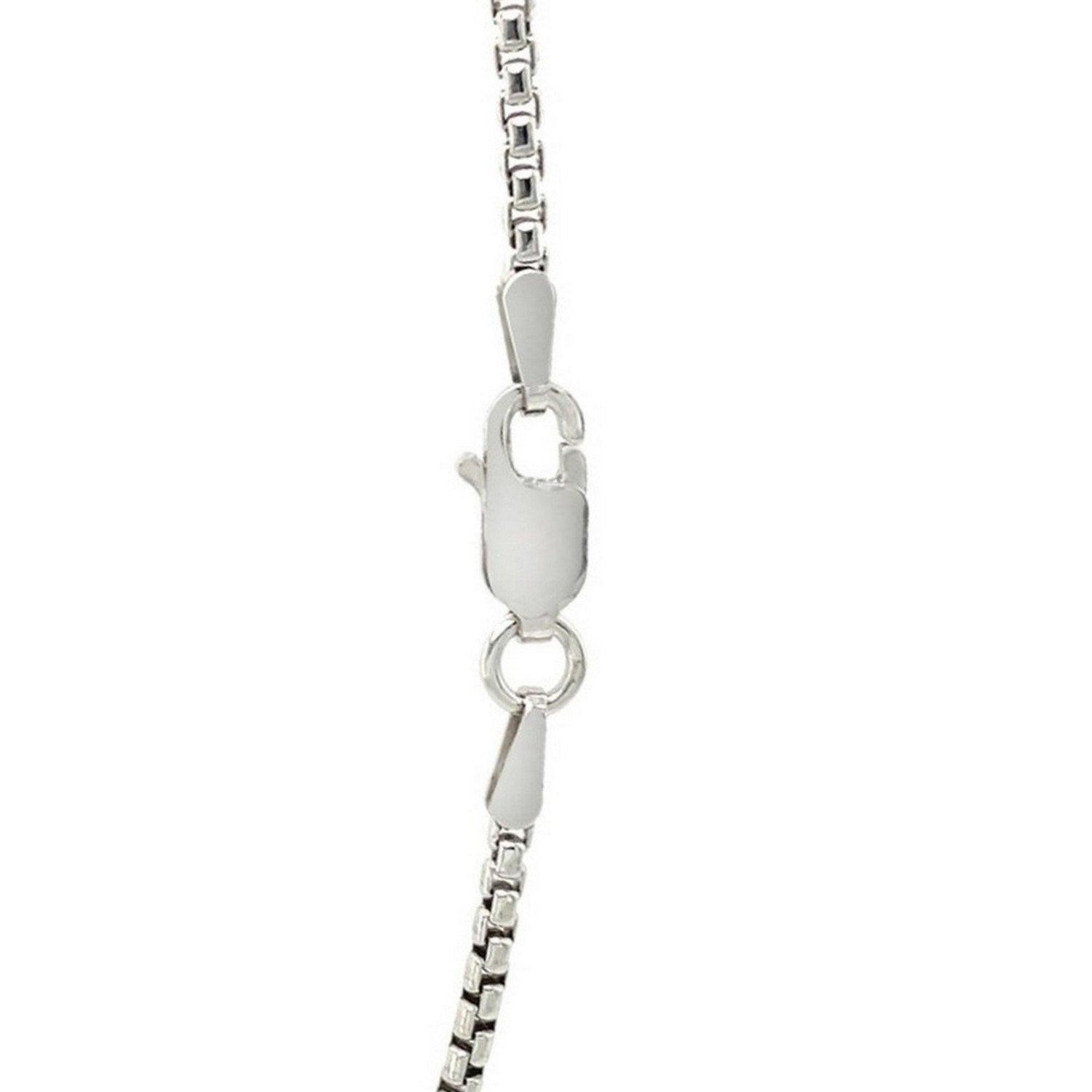 This rhodium-plated round box chain comes in sterling silver and has a width of 1.8 millimeters.