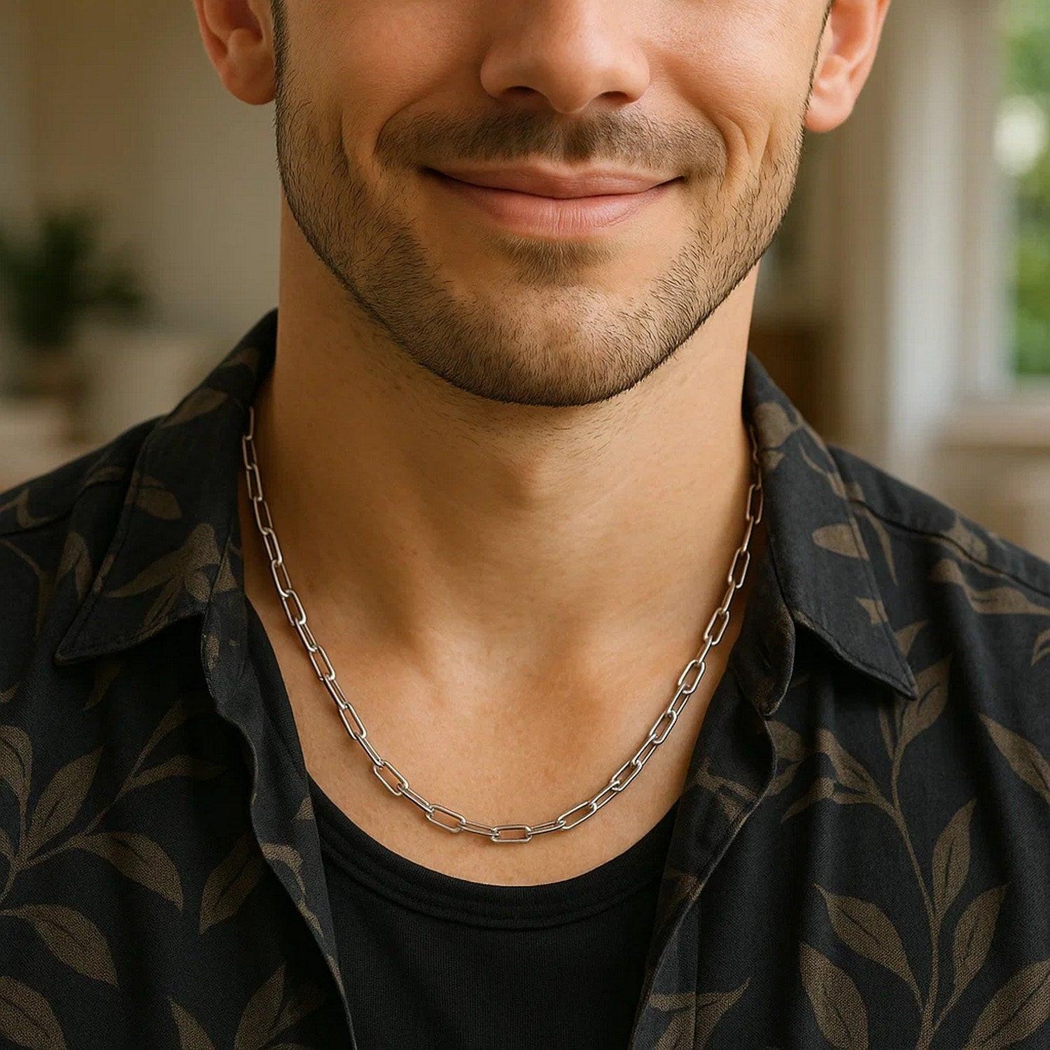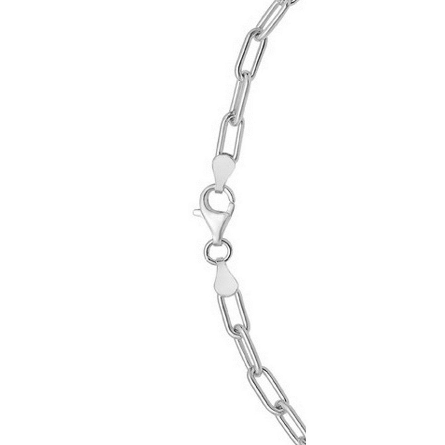 Crafted in sterling silver with a bright rhodium finish, this 4.10 mm round link paperclip chain features bold, rounded elongated links that offer a modern, airy silhouette and a polished, high-shine look, making it a standout piece perfect for wearing solo or pairing with your favorite statement pendant.