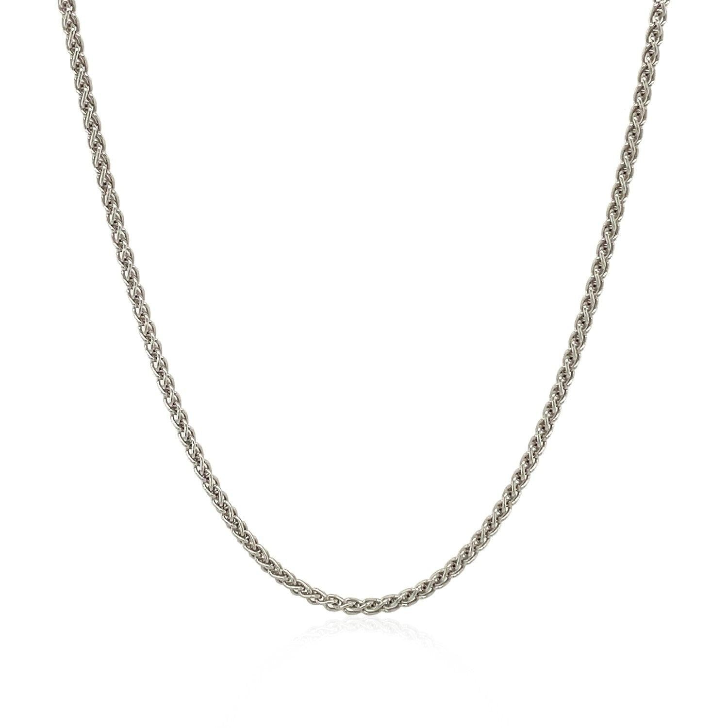This rhodium-plated wheat chain comes in sterling silver and has a width of 1.3 millimeters.