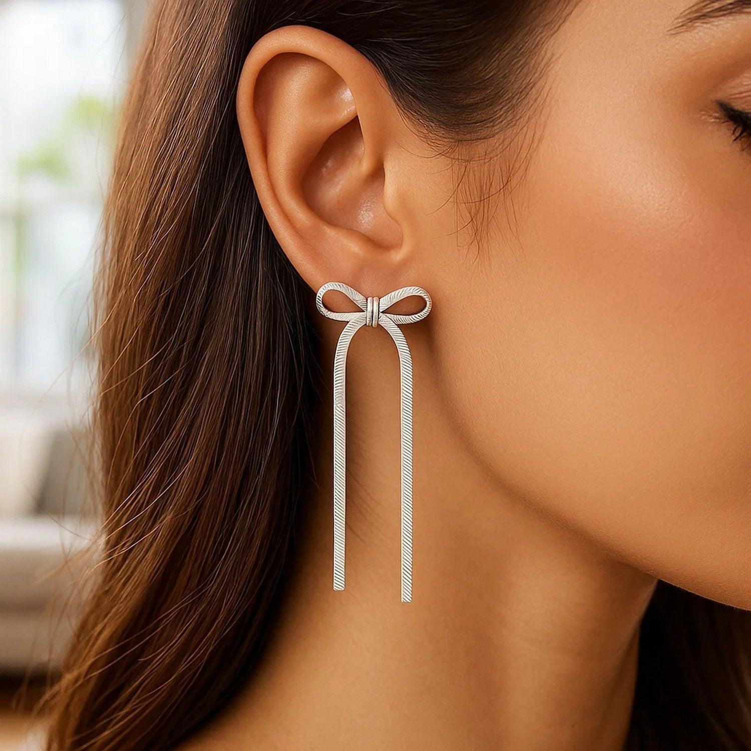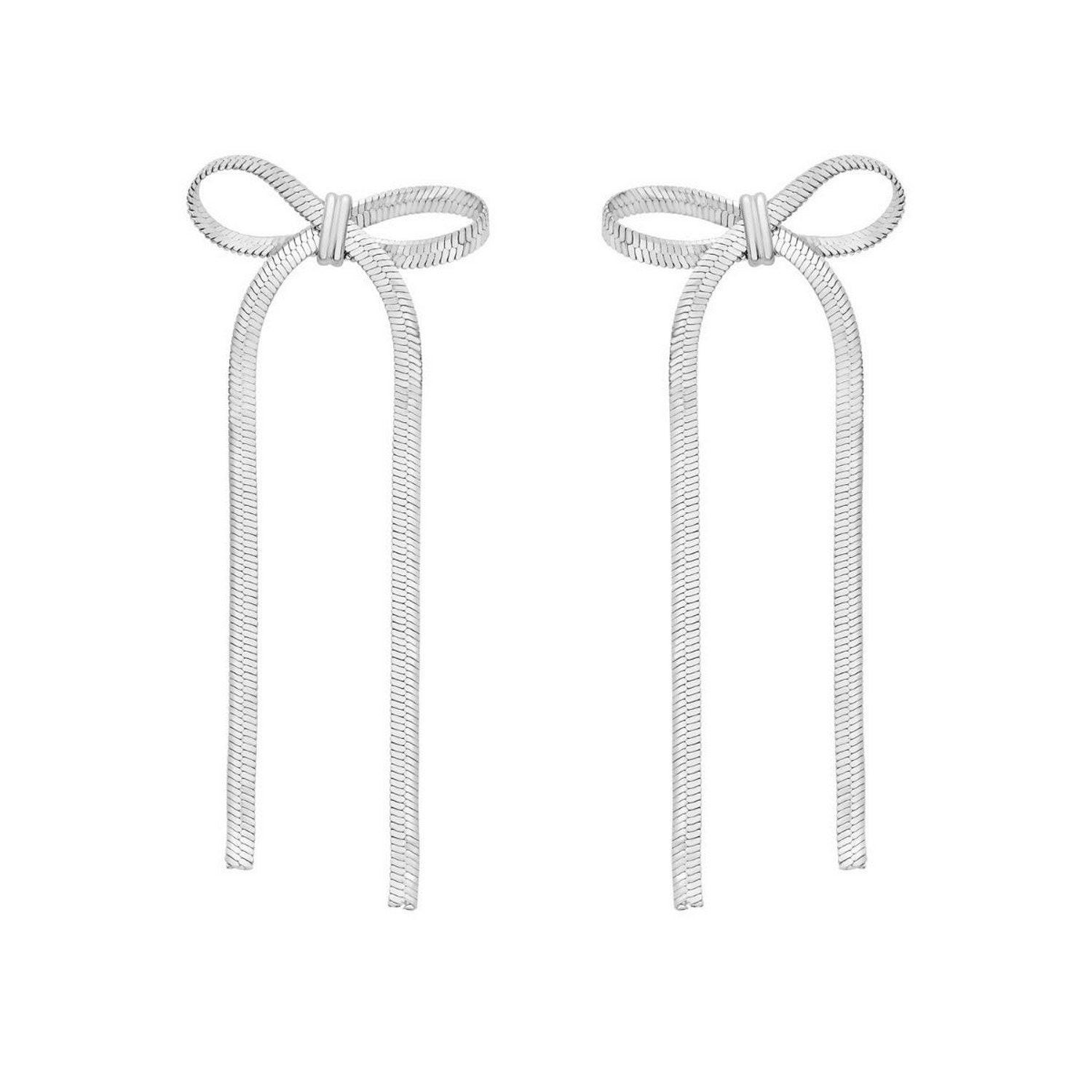 Chic sterling silver snake chain drop dangle bow earrings featuring a graceful bow design accented by flowing snake chain drops. The polished finish adds radiant shine, creating a feminine and elegant look perfect for any occasion.