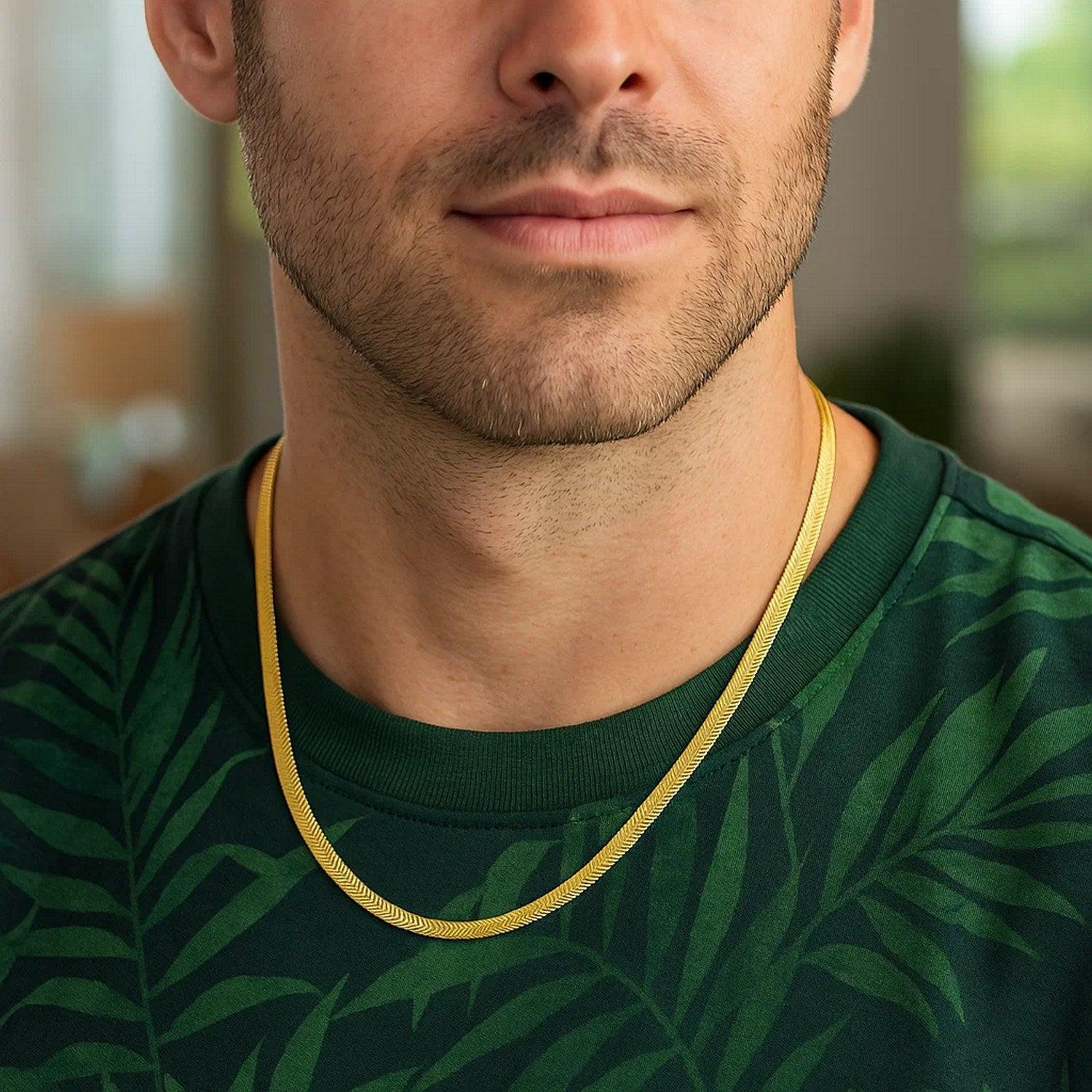 Crafted in sterling silver with a rich yellow gold plating, this 3.40 mm imperial herringbone chain features smooth, tightly woven links that create a fluid, mirror-like shine, offering a luxurious, elegant look perfect for wearing as a standout statement piece or layering with other favorites.