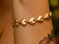 This sterling silver yellow gold plated puffed hearts bracelet features multiple polished, dimensional heart charms along a radiant chain. Its warm golden shine and romantic design make it perfect for everyday wear, layering, or gifting.