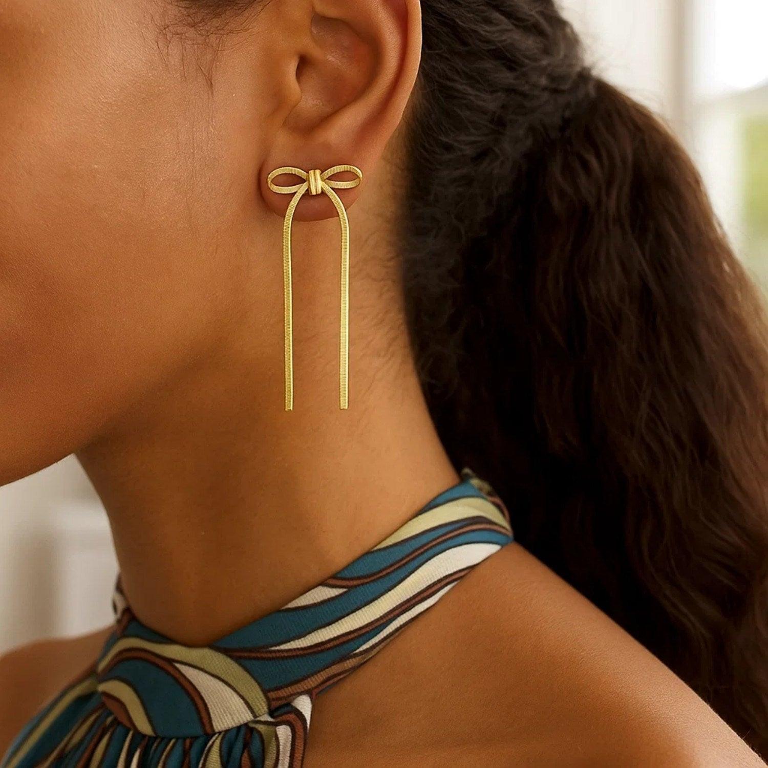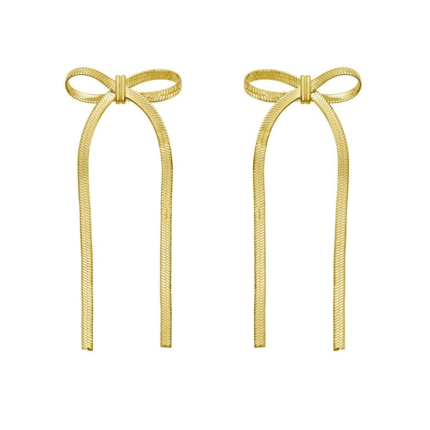 Elegant sterling silver yellow gold plated snake chain drop dangle bow earrings featuring a delicate bow design with flowing chain drops. The polished gold finish adds warmth and radiance, creating a graceful and sophisticated look for any occasion.