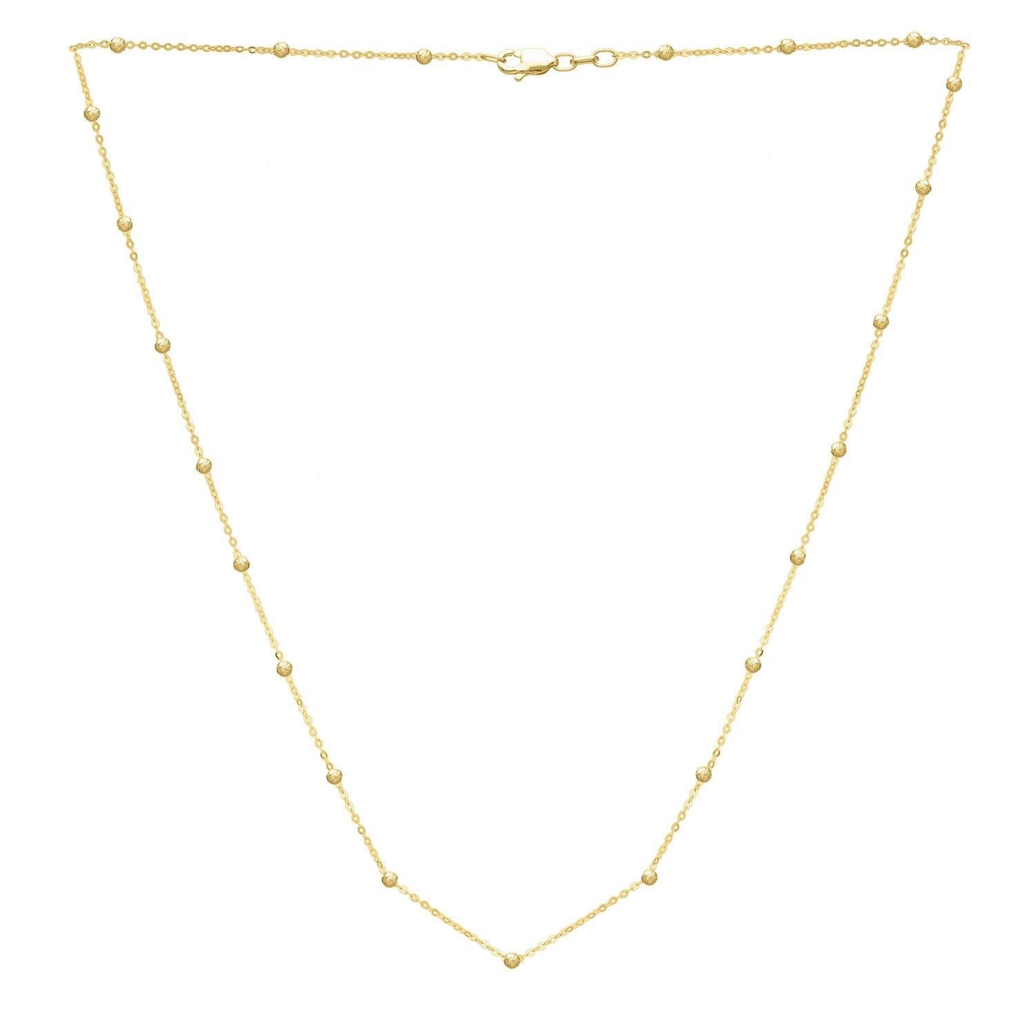 This 14k yellow gold saturn bead chain necklace showcases a radiant yellow gold finish and intricate bead detailing that enhances both its shine and depth. The subtle texture of the spaced beads, interconnected by a delicate chain section, adds visual interest. This striking necklace is an ideal gift for those looking to elevate their style with a touch of glamour and finesse. Secured with a lobster clasp closure available in an 18 inches length.
