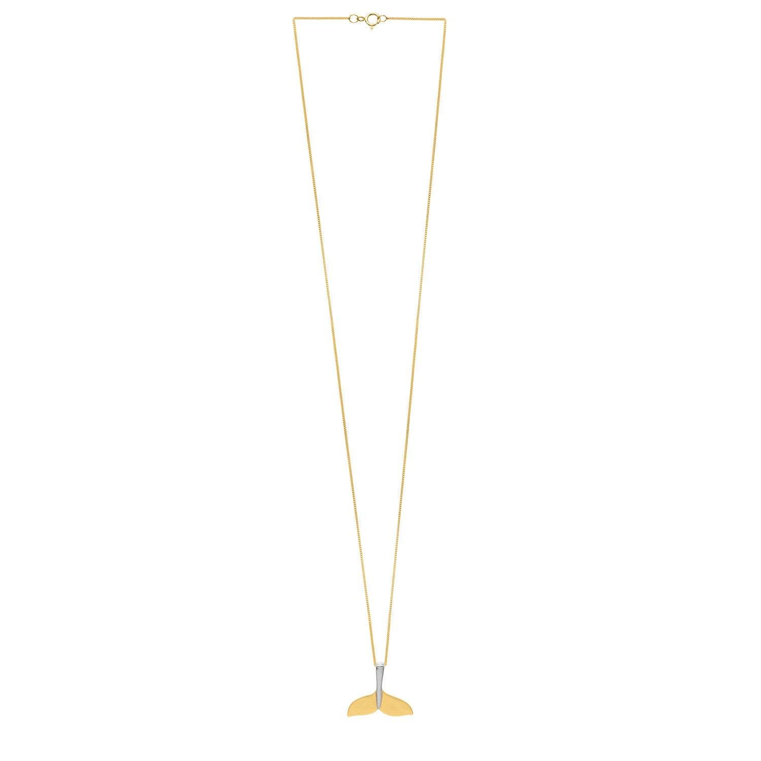 Inspired by the majesty of whales, this 10k two-tone gold necklace features a polished whale tail pendant. Symbolizing freedom, strength, and a connection to the ocean, the pendant is elegantly suspended on an 18 inches chain with a spring ring clasp. A meaningful piece that pays tribute to the grace and resilience of these magnificent creatures.
